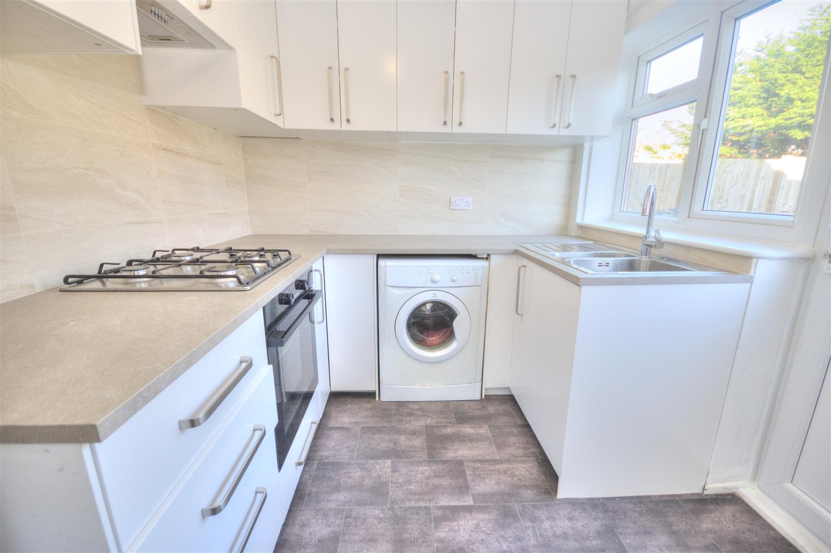 UPVC frosted double glazed door and window to rear elevation, vinyl flooring, range of wall and base units, 1 1/2 bowl stainless steel sink with chrome mixer tap and drainer, integrated oven and grill, plumbing for white goods, tiled splashback.