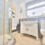 UPVC frosted double glazed window to rear elevation, tiled floors, part tiled walls, WC, wash hand basin, radiator, walk in shower, downlights, composite panelling.