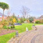 Off road parking, lawn with mature shrubs and trees, access to garage.