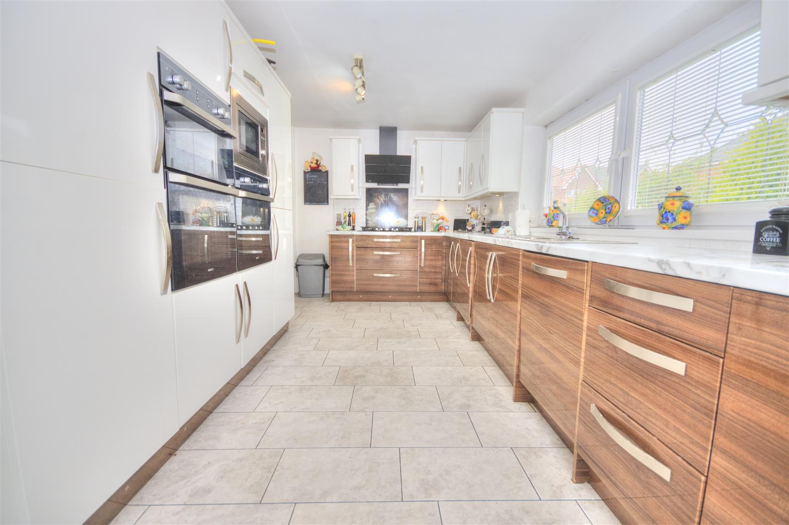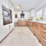UPVC double glazed window to side elevation, UPVC double glazed double doors to rear elevation, radiator, tiled flooring, range of wall and base units, 1 1/2 bowl stainless steel sink with chrome mixer tap and drainer, multi burner gas hob with extractor fan, integrated appliances include, dishwasher, fridge, freezer, double oven, grill and microwave, downlights.