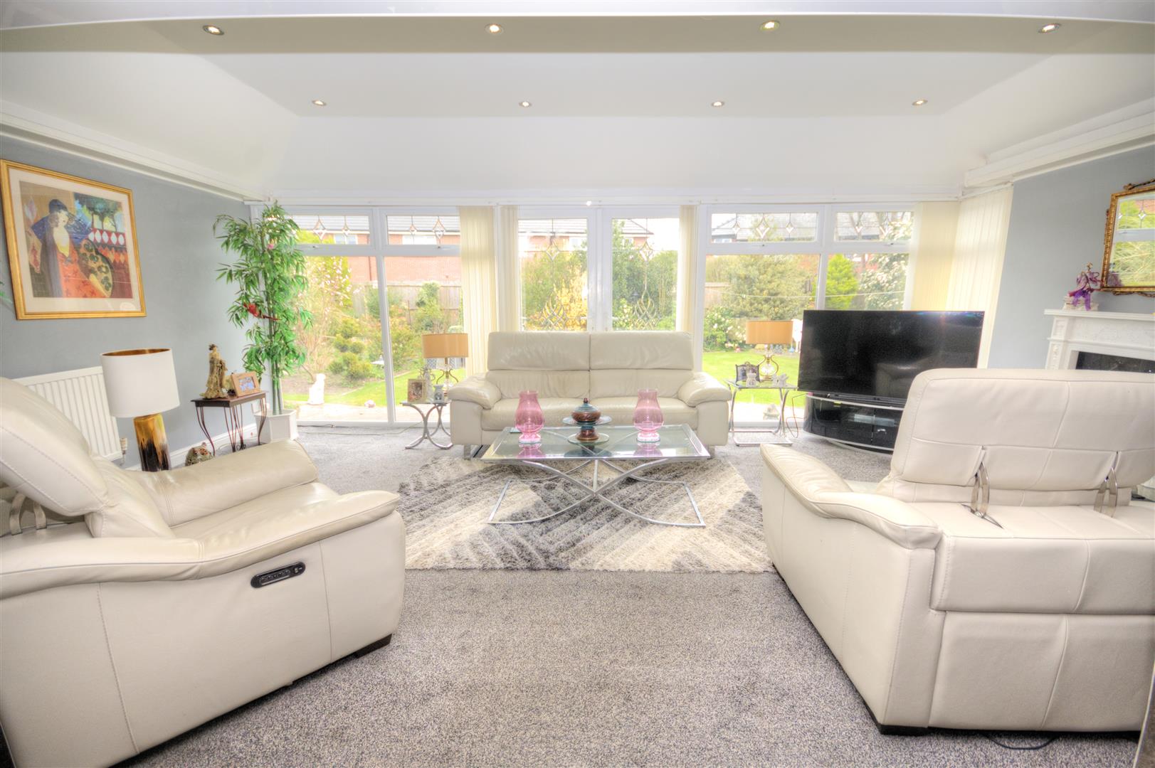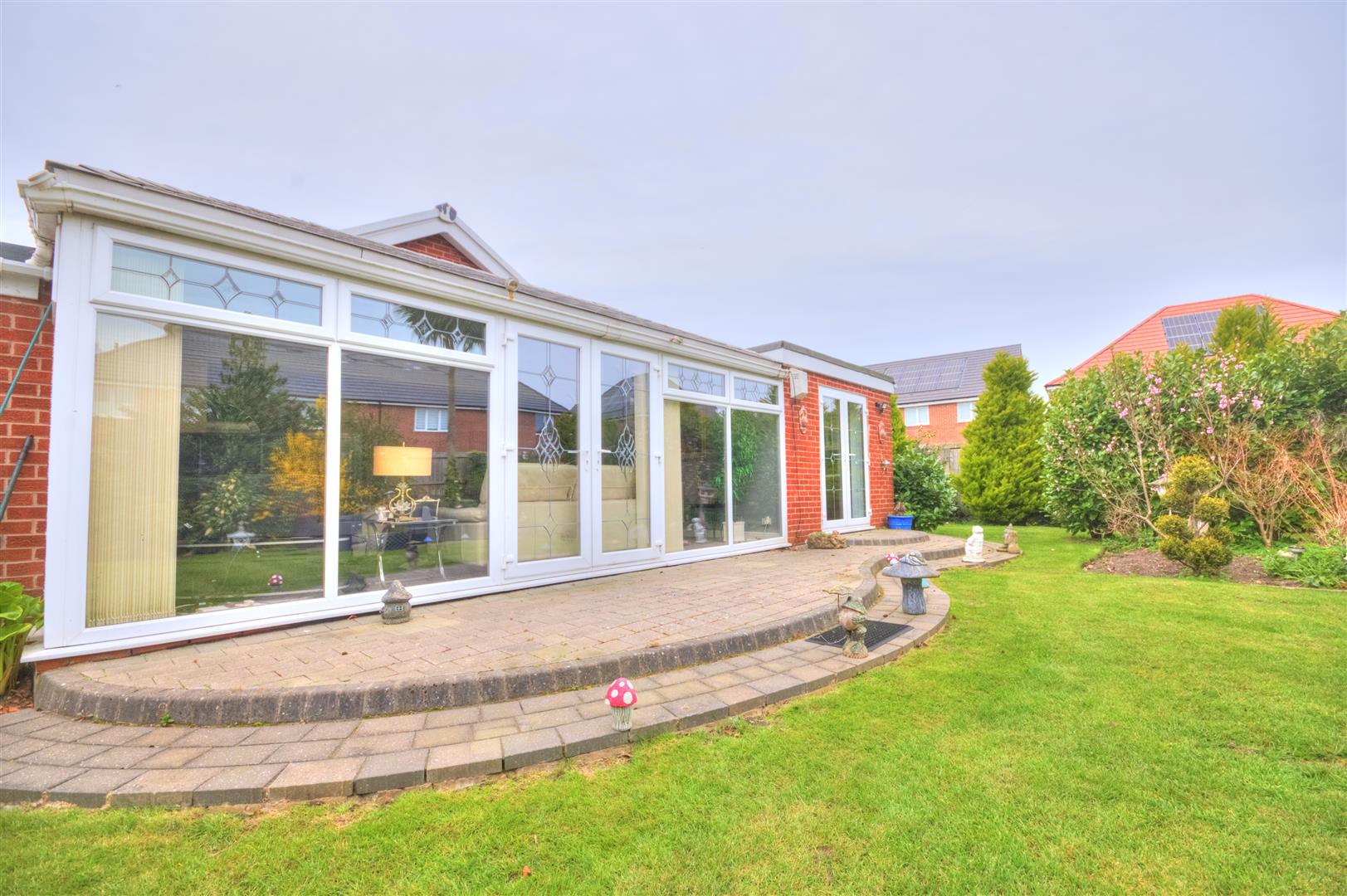 UPVC double glazed double doors and windows to rear elevation, carpeted flooring, wall sconces, radiators.