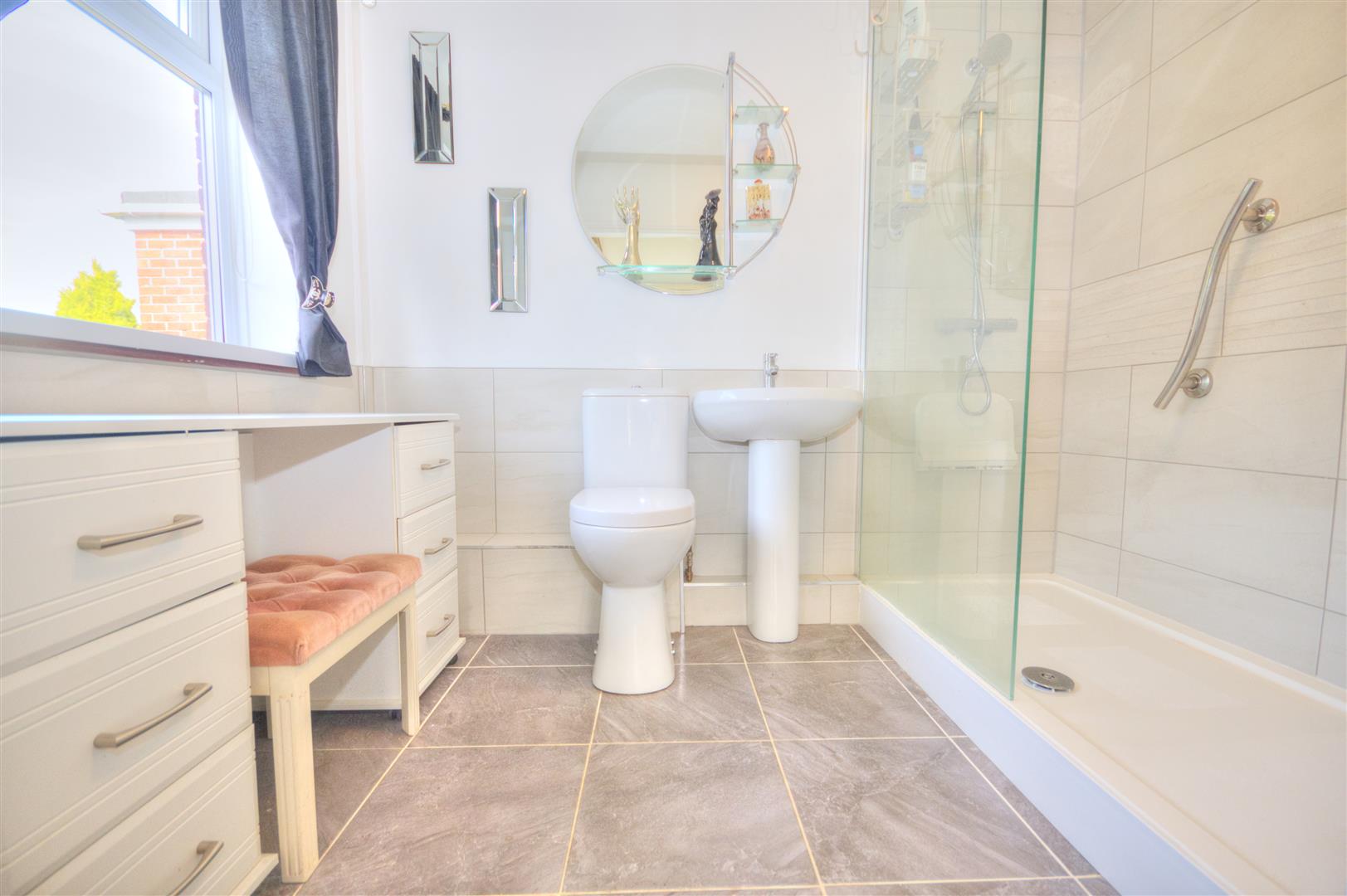 UPVC double glazed window to rear elevation, tiled flooring, part tiled walls, WC, wash hand basin, walk in shower with rainfall shower head, radiator.