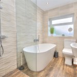 Tiled walls and floor. Free standing bath, walk in shower, wc and basin. UPVC window to rear, radiator.