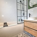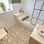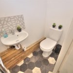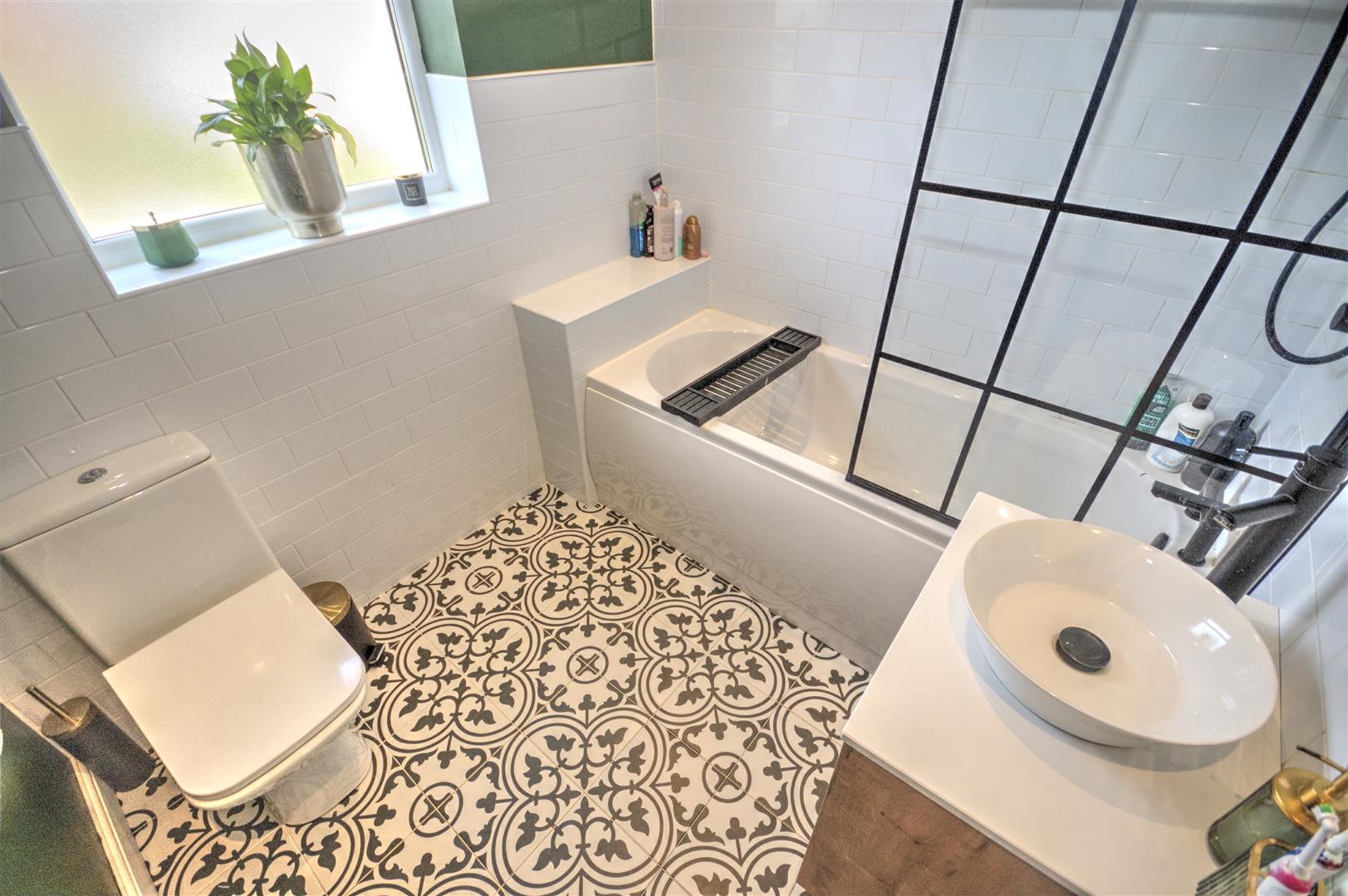 Tiled flooring, part tiled wall. UPVC frosted double glazed unit to rear elevation. WC. Floating vanity unity. Down lights, extractor fan, bath, black shower head over bath.