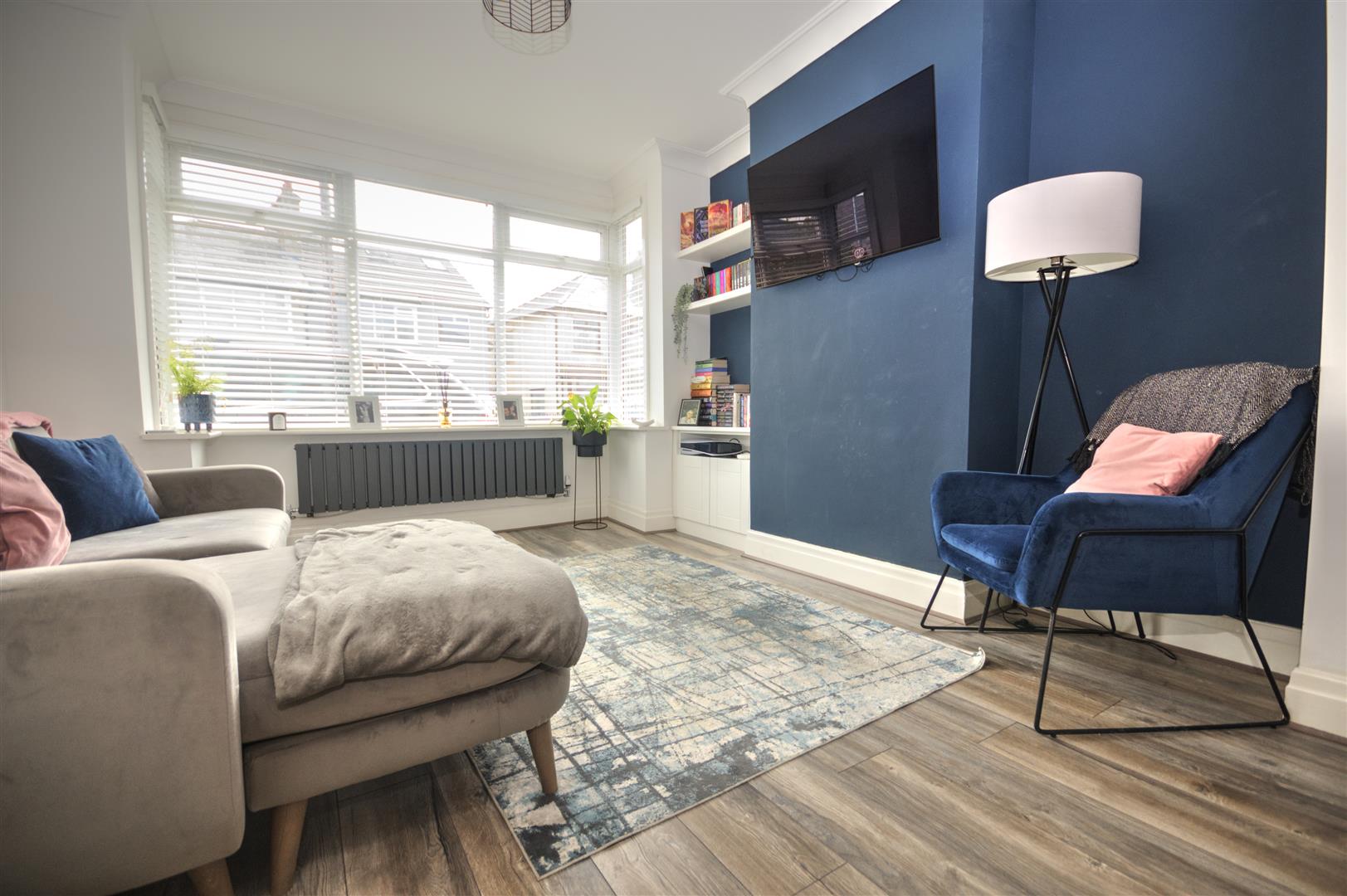 UPVC doubled glazed bay style window to front elevation. Laminate flooring, fitted storage in left recess - Radiator.