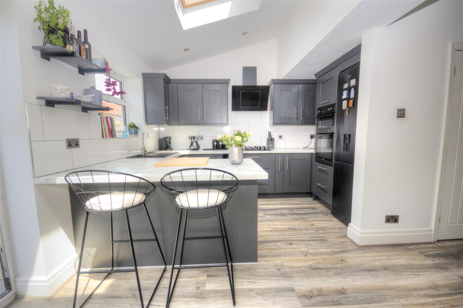 Laminate flooring continues through. Sink with chrome mixer taps and drainer- UPVC double glazed unit. Range of wall and base units -space for fridge freezer, intergrated oven and grill, multi burn Range master hob with extractor fan - intergrated dishwasher - part tiled.