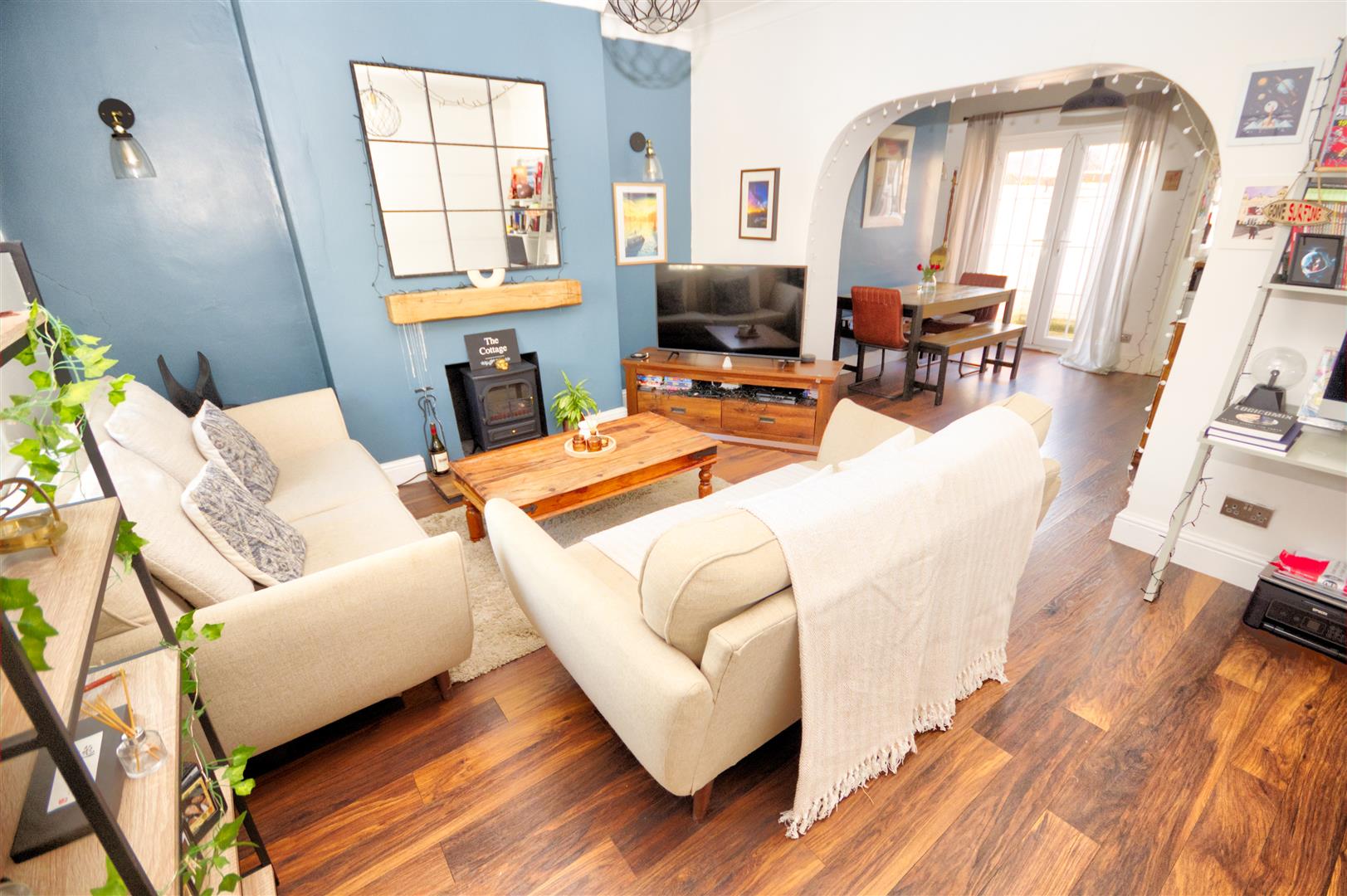 A beautifully presented and inviting principal reception room, positioned to the front of the property. A large UPVC double glazed window provides excellent natural light, enhancing the sense of space. The room is finished with modern décor and features a focal point fireplace with log burner set against a stylish chimney breast, creating a cosy yet contemporary feel. Open plan access through to the dining room makes this an ideal space for both relaxing and entertaining.