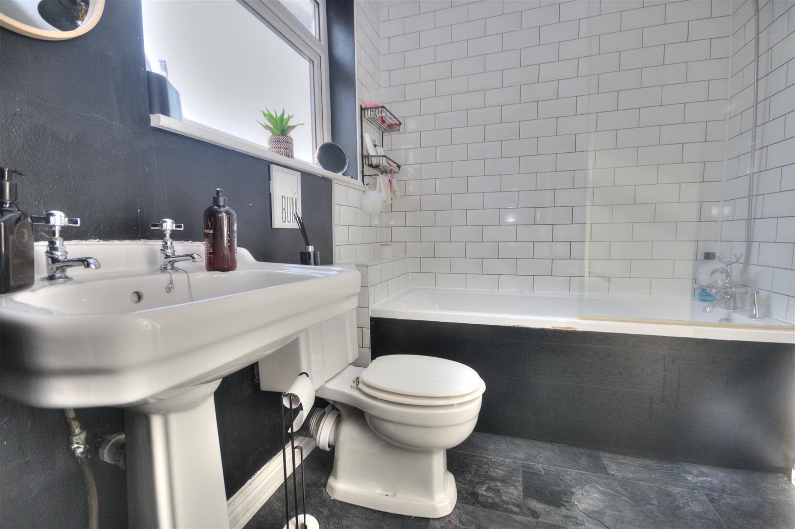 A contemporary bathroom fitted with a three-piece suite comprising a panelled bath with shower over and glass screen, pedestal wash hand basin and WC. Finished with modern tiling and contrasting décor, with a window providing natural light and ventilation, airing cupboard.